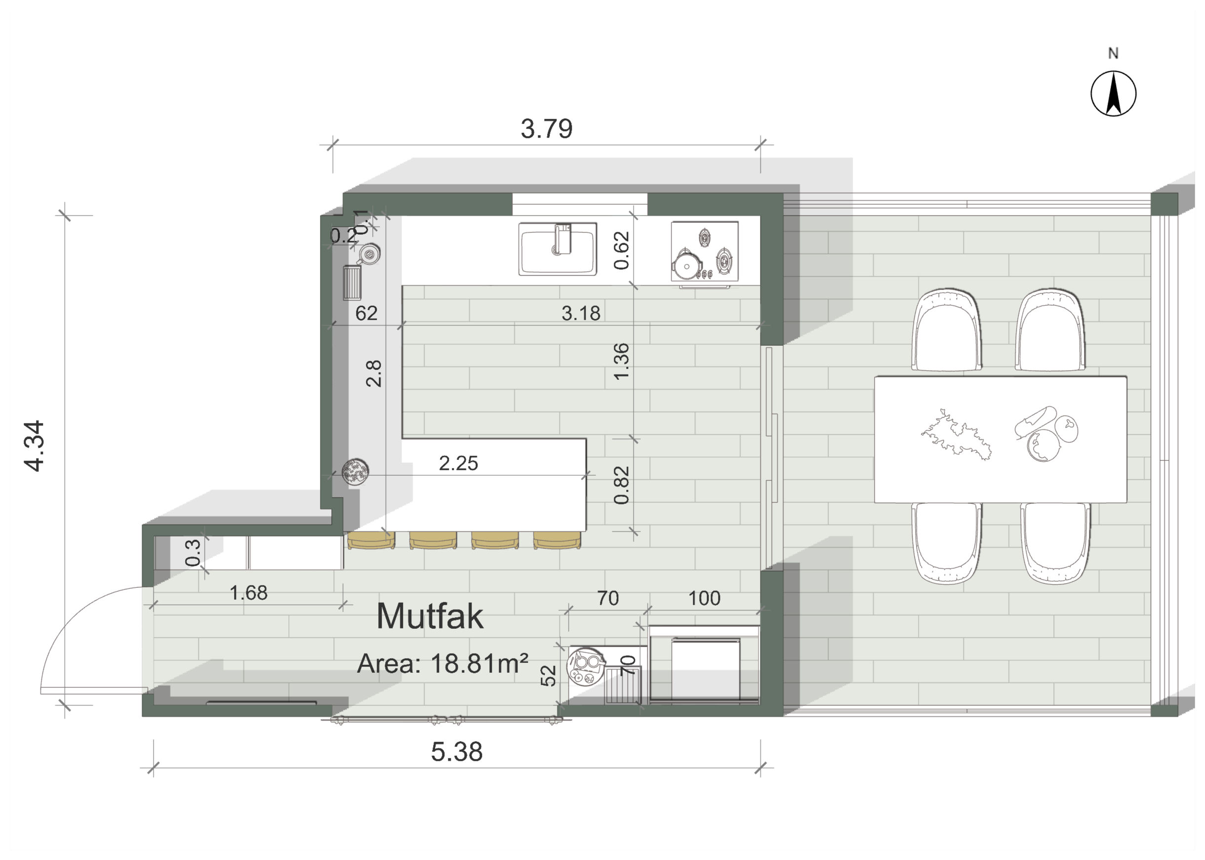 Öncelikle mutfak alanında ergonomi ve kullanım kolaylığı ön planda tutulmuştur. Depolama çözümleri, geniş tezgâh yüzeyleri ve akıcı sirkülasyon sayesinde konforlu bir kullanım sağlanmıştır. Açık renk paleti ve doğal ışık kullanımı ile ferah ve aydınlık bir atmosfer elde edilmiştir. Danışan talebi doğrultusunda tezgah planlaması gerçekleştirilmiştir.