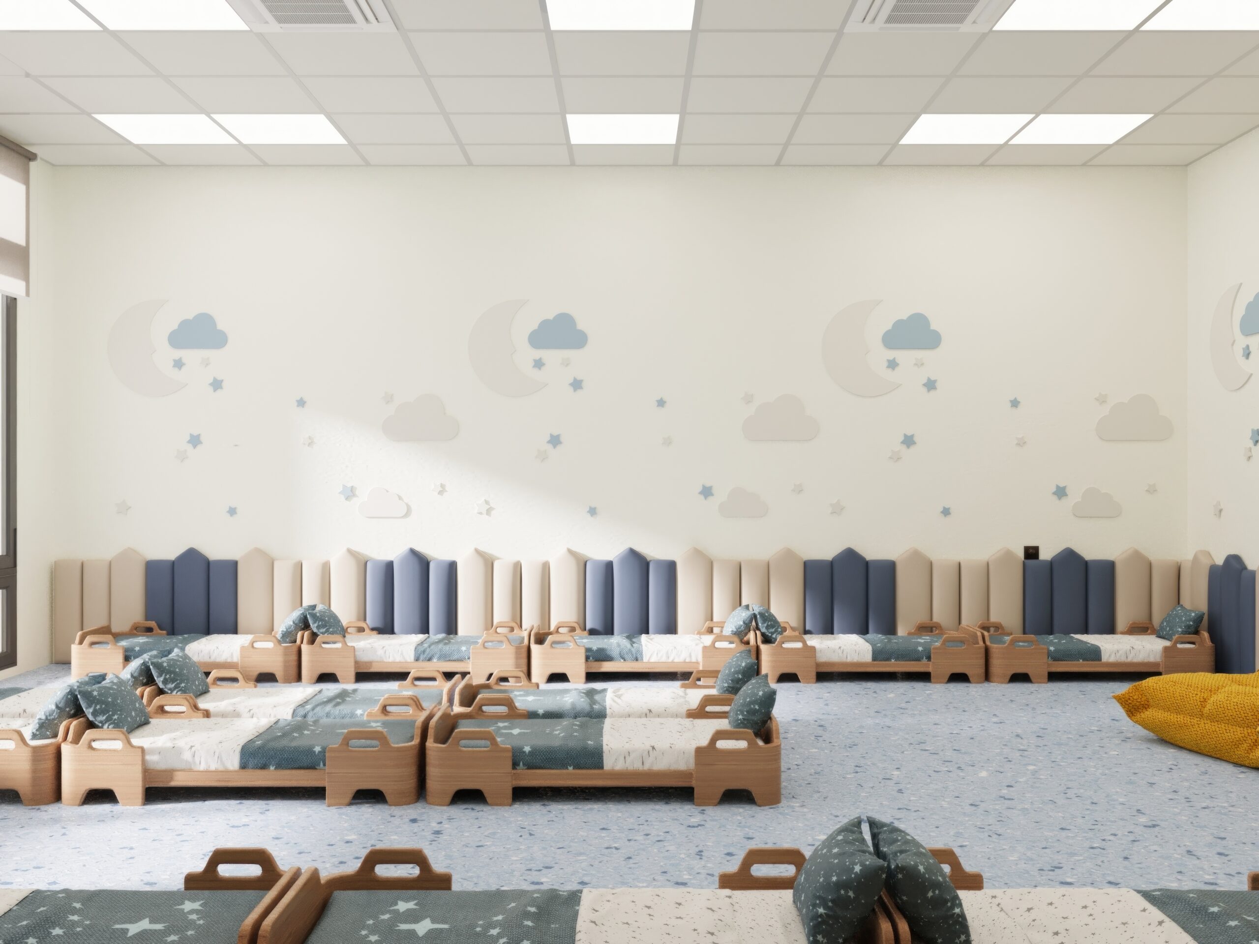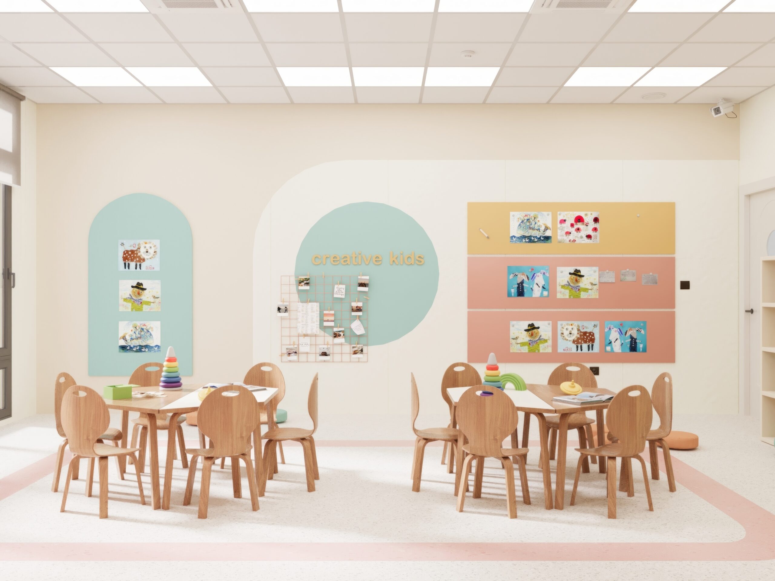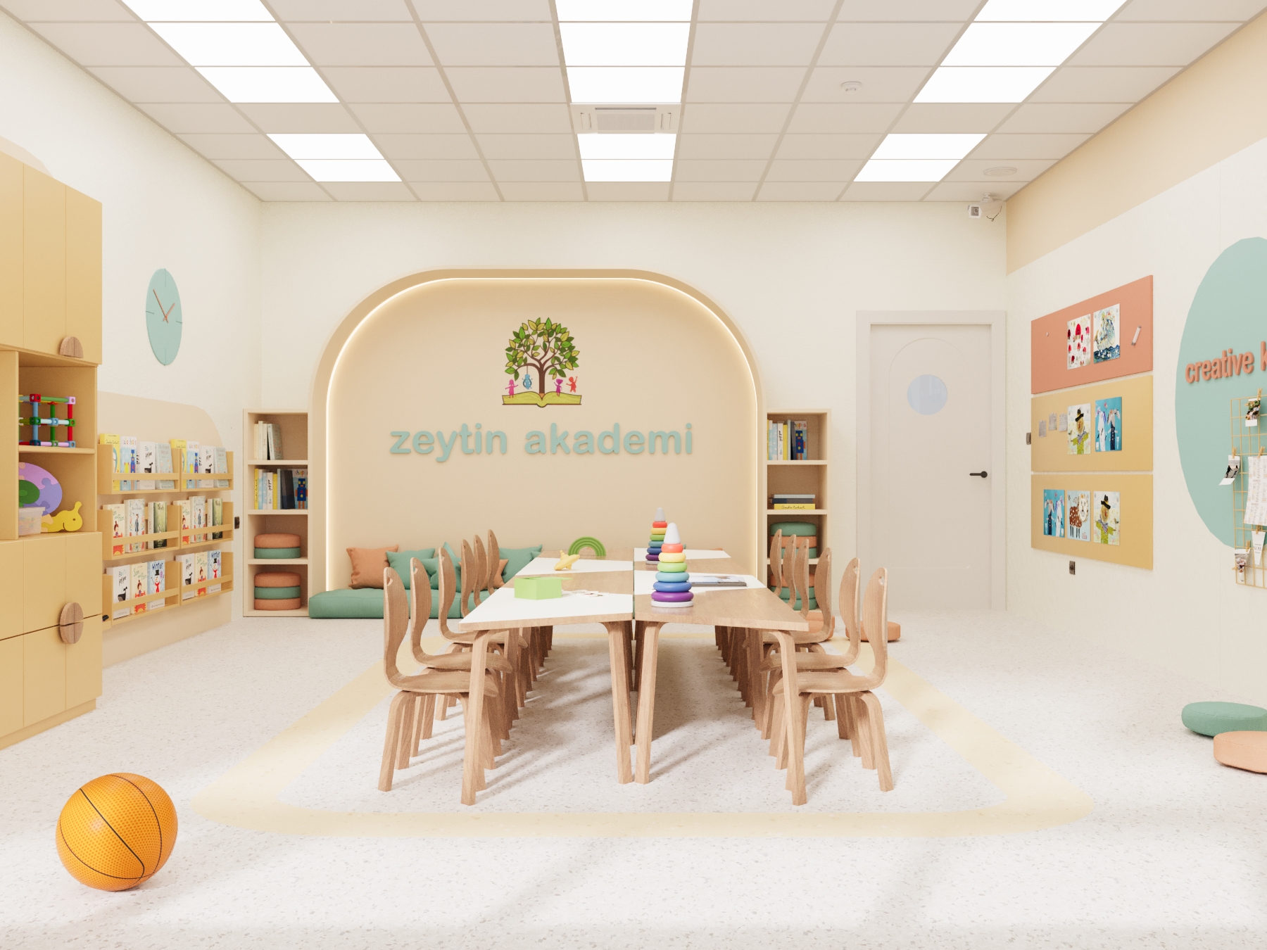 Bu projede anaokulu iç mekân tasarımı kapsamında çocuklar için güvenli ve konforlu bir eğitim ortamı oluşturuldu. Öncelikle sınıf düzenleri çocuk ergonomisine uygun ölçülerle farklı yaş gruplarına özel planlandı. Böylece öğrenciler alanı rahat ve özgür şekilde kullanabiliyor.